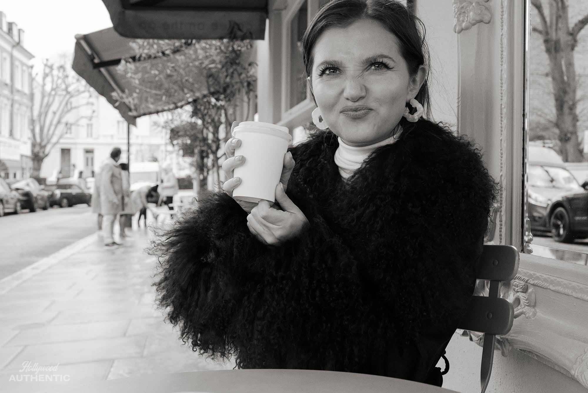 I ask if the dance background helps with that unconsciousness – in using her body as a tool of expression. She shrugs. ‘If I had to go and do a job where I had to do intense dance training beforehand for a role – a ballet dancer or something like that… something like Black Swan would be my absolute dream.’ The snow is falling more heavily now and we decide to head back to the house of one of Mia’s friends to warm up. The cold doesn’t put a dent in Mia’s mood or enthusiasm. She says she’s been likened to the Duracell Bunny. ‘Do you see it? Do you see the resemblance?’ she laughs. In terms of going on and on, I feel she’s set on a long career path…