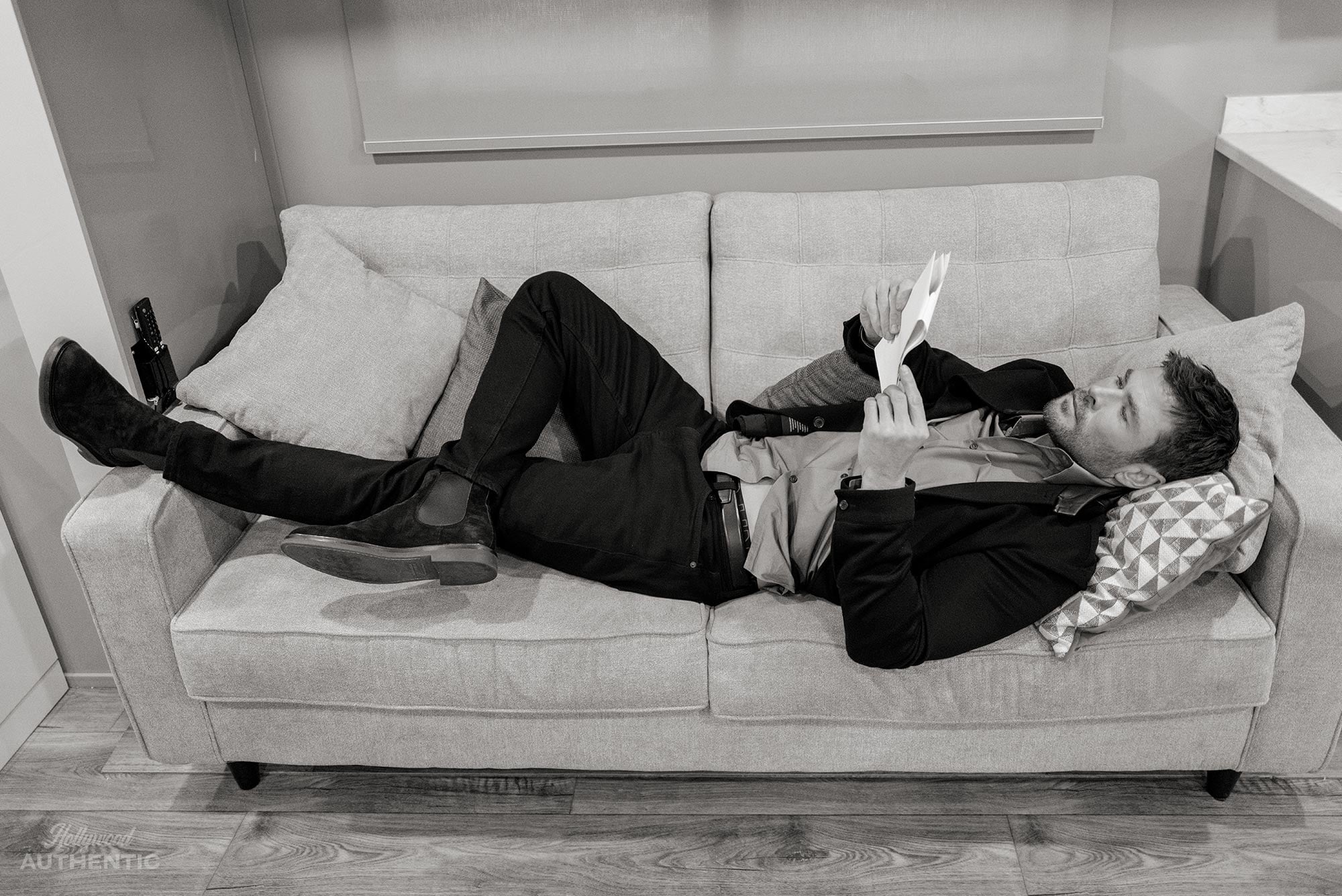‘It has changed throughout my career,’ he tells Hollywood Authentic of how he chooses projects the day after the London premiere for the film. Part of the filming took place in the UK, where Greg Williams captured the cast on-set. ‘Initially, it was about keeping some sort of continuity with the characters I was playing. That was also when I was being sent a lot of bigger action-type films. Then I was curious about doing comedy. But I guess now it’s just about it not feeling repetitive, and seeking something that is going to motivate you to dig as deep as possible because there’s a fascination or a curiosity or a world you haven’t inhabited before. That was what instantly struck a chord when I read this script. The character didn’t fall into an archetype or trope that felt familiar from something I had ever done, or something I had even seen before. This was an individual who was highly skilled in his line of work, and there was obviously a strength and a confidence there. But there was this fragility and vulnerability, which I thought humanised him in a great way, and allowed there to be layers of complexity that could be surprising for an audience.’